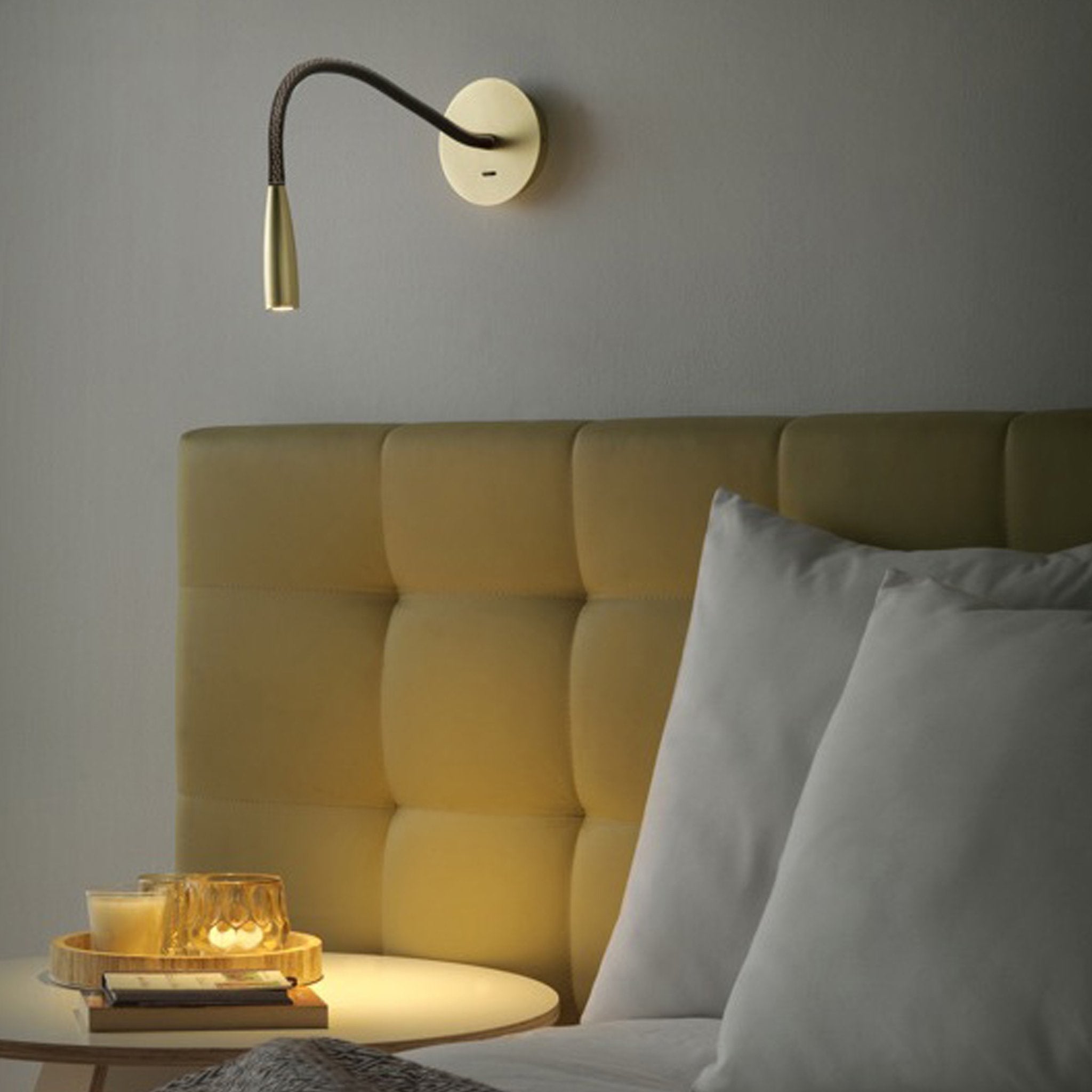 O candeeiro de parede Rije é caracterizado pelo seu ajustável braço. Este candeeiro com acabamento dourado assume um estilo MINIMAL e BURLESQUE. É a iluminação perfeita para colocar junto a uma cama como luz de leitura.