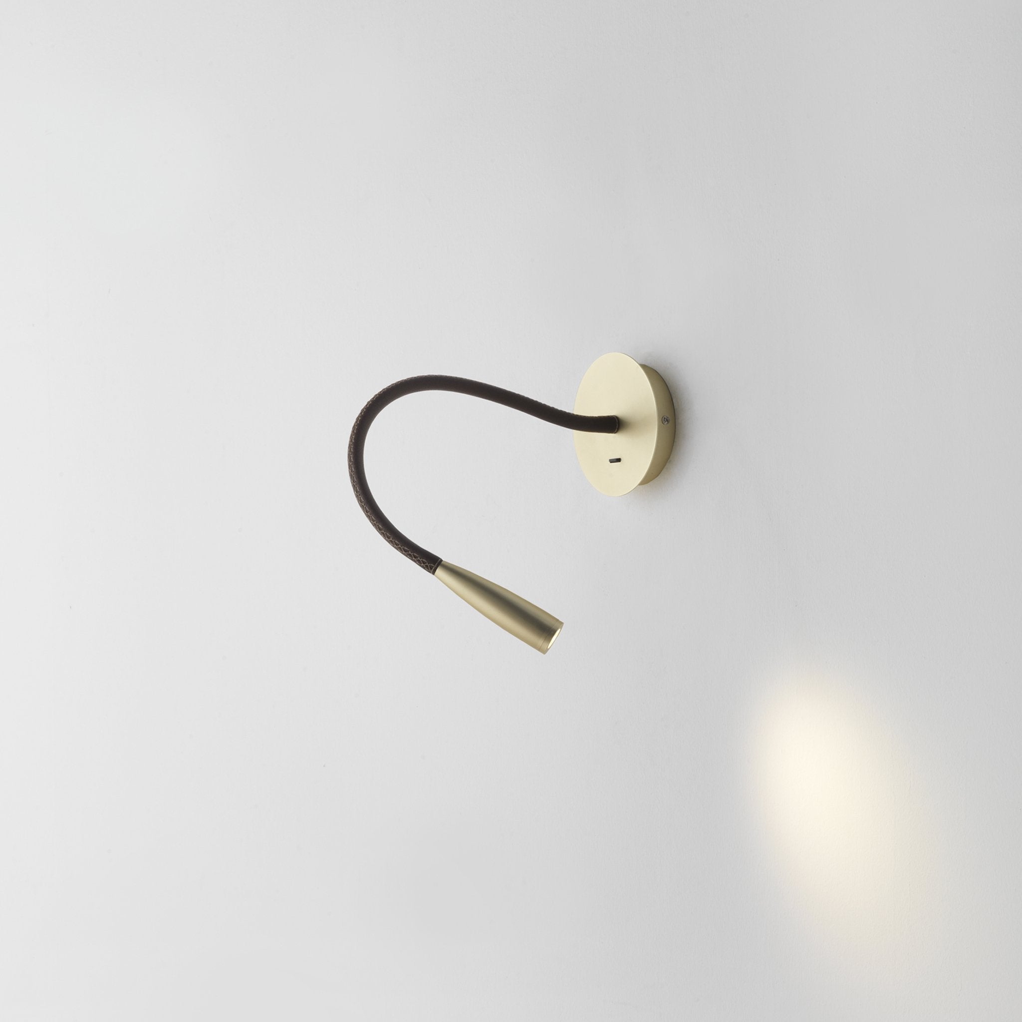 Características: Aplique de aço com acabamento em ouro fosco e braço de couro Chip LED 3W 3000K 270lm (incluído). |